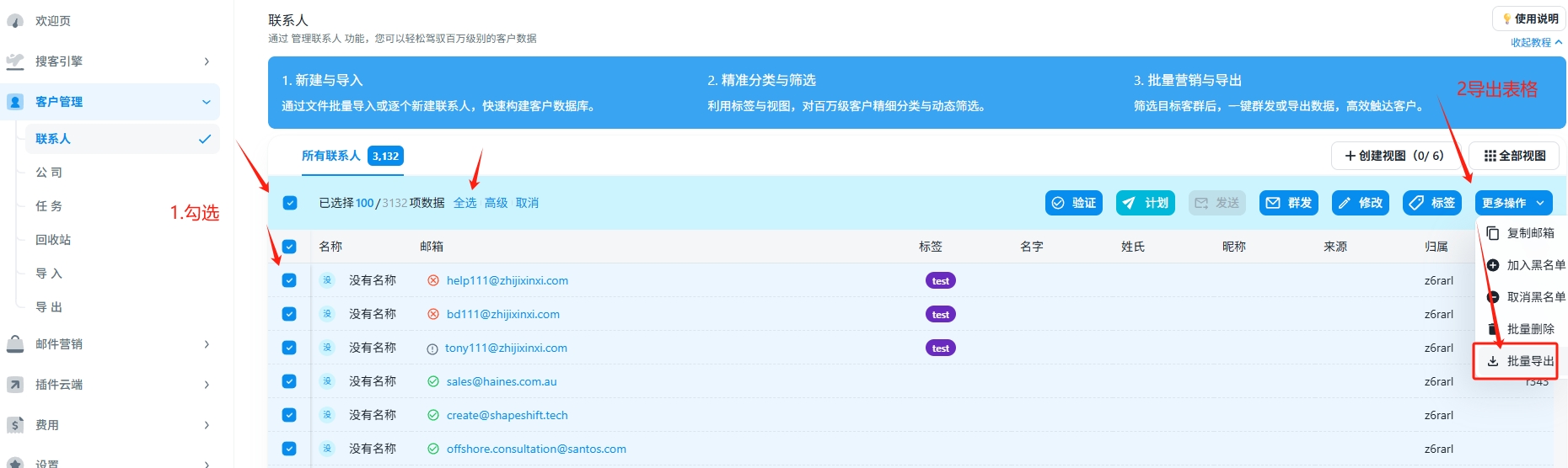 公司信息补全之后,您可以通过系统,进行csv表格数据导出,包含:客户姓名,公司信息,email等信息,然后进行营销邮件的发送,