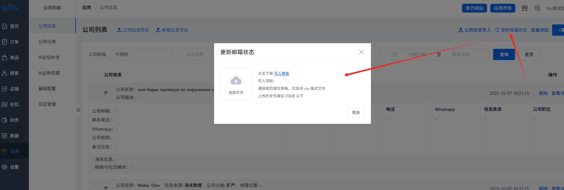 3.进入fecify后台,根据系统要求的csv格式,修改表格的列,然后导入系统,进行更新邮件的状态