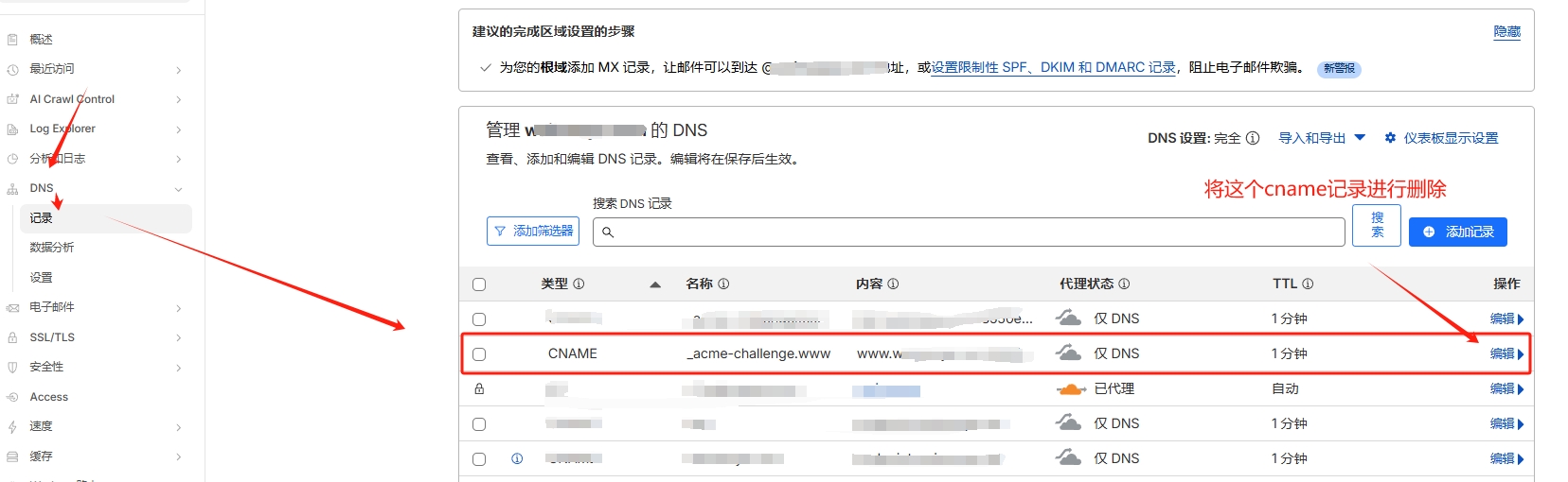 - 注意:删除记录,别删除错了,将txt等其他的删除了,这里删除的是cname解析记录