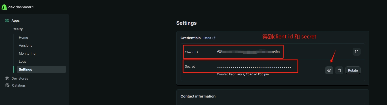 - 您需要记录下来Client ID 和 Secret (fecify后台,shopify同步数据插件里面需要进行配置)