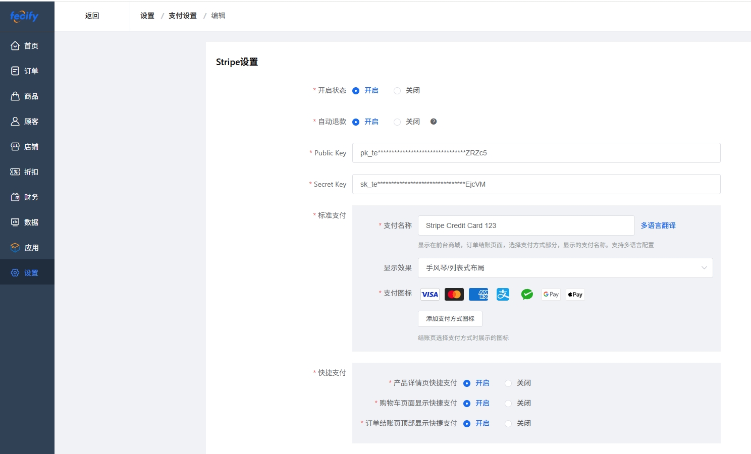 - Stripe状态:是否开启stripe,开启后,在订单结账页面,将会显示stripe支付方式