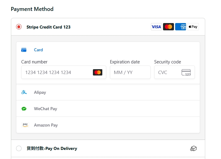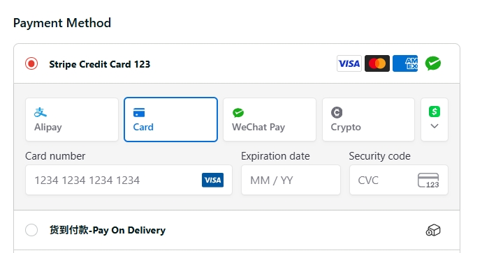 - Stripe支付名称:在前台商城-订单结账页-支付方式部分,显示的名称,您可以点击多语言编辑,编辑在其他语言下的支付名称。