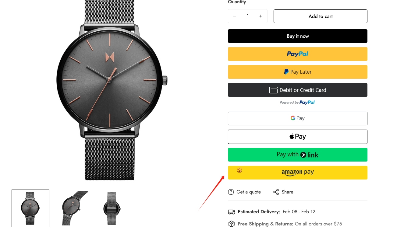 - 产品详情页快捷支付:在商品详情页(类似于paypal),显示stripe支持的快捷支付,包括:linkpay,amazonpay,googlepay,applepay等