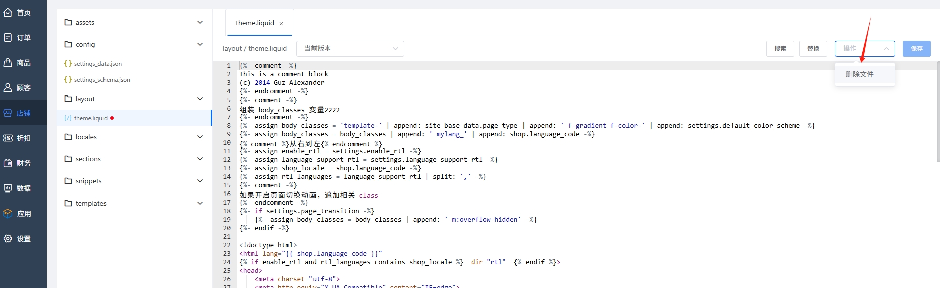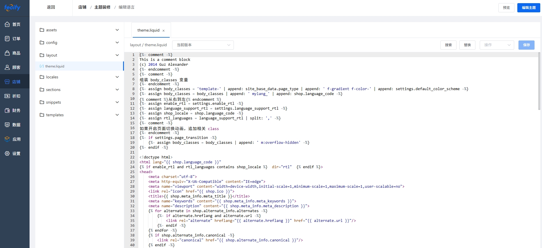 这些文件,里面都是模版代码,layout/theme.liquid是入口文件,sections下是装修卡片文件,snippets下是小部件文件,assets是js和css等静态文件