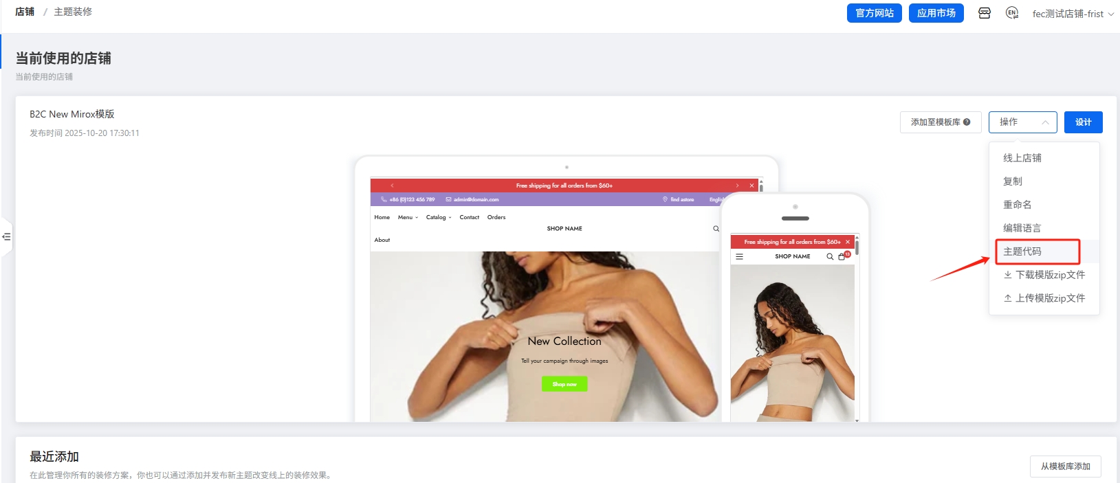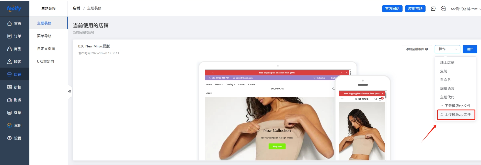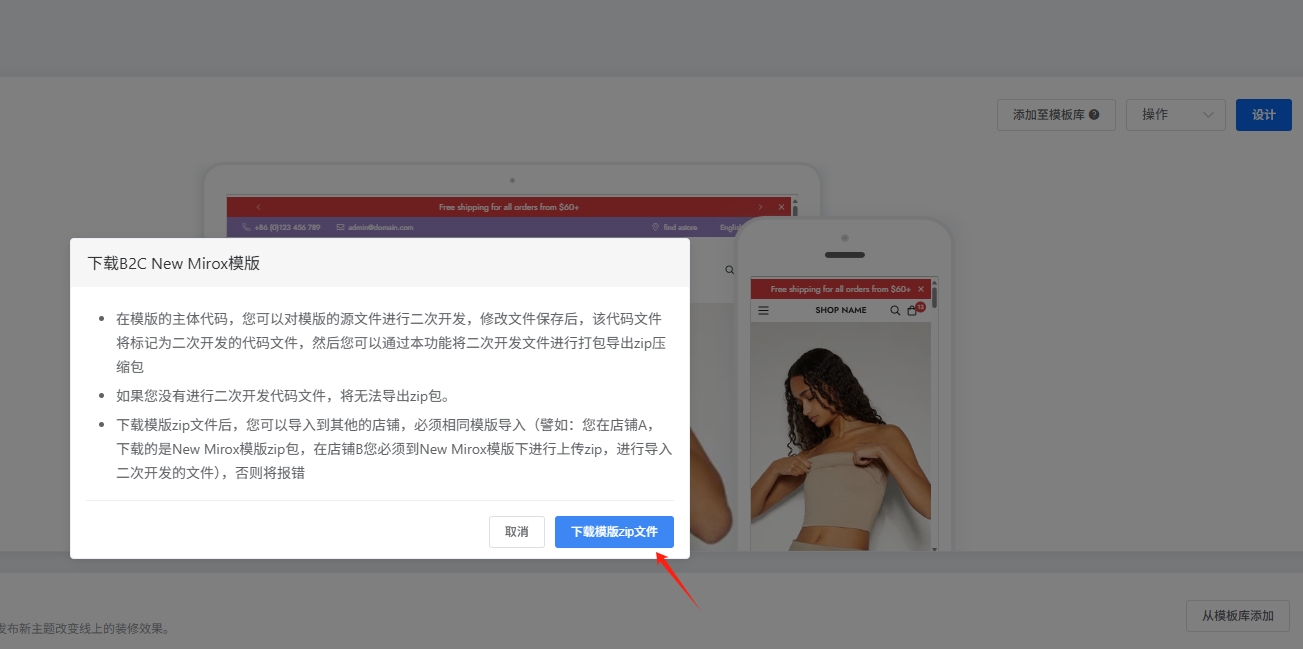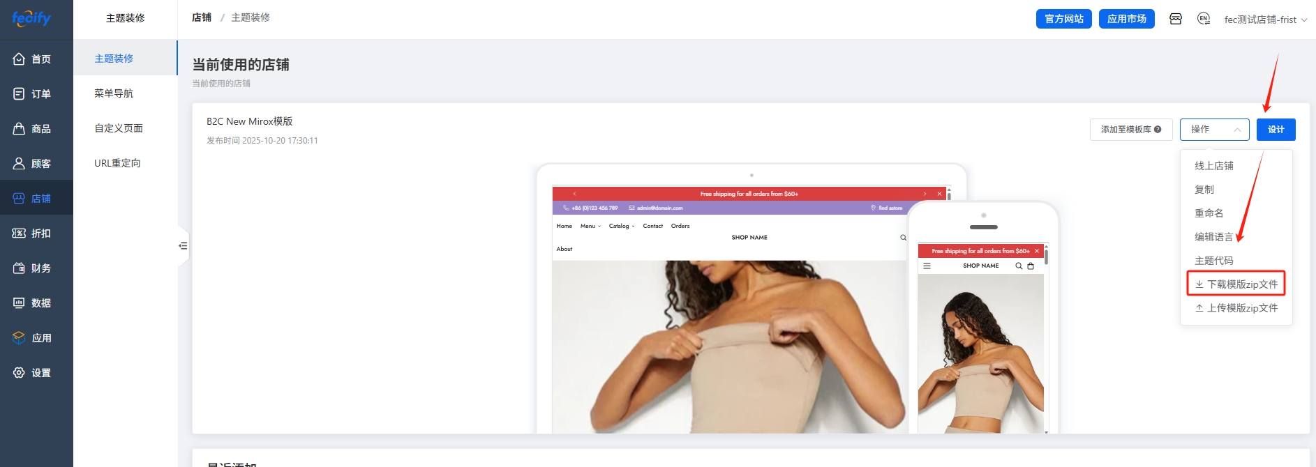 如果您是一位前端开发人员,对模版进行了二次开发,修改了内容,然后想把自己修改的内容进行打包zip,导入到其他的店铺,您就可以使用本部分的功能