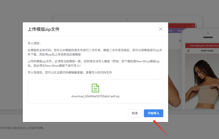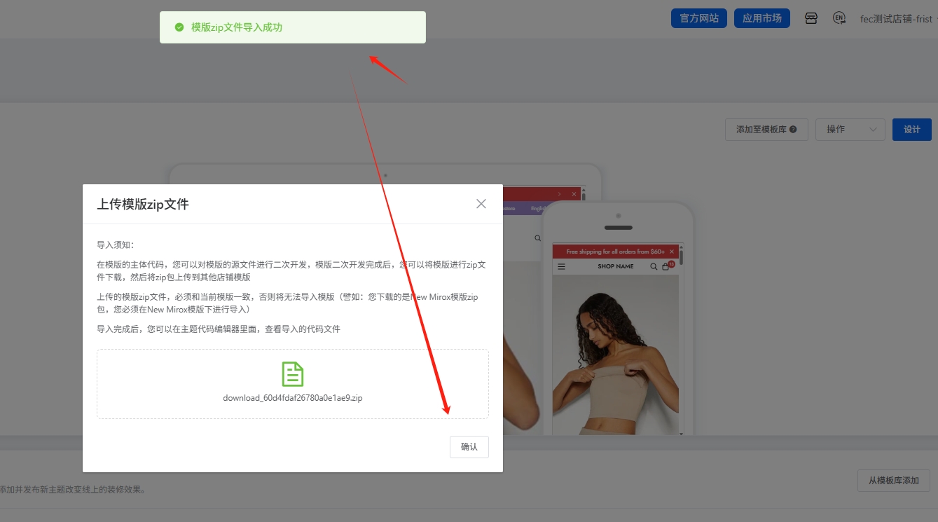 1.zip压缩包导入后,导入的另外店铺,模版名称必须对应,不可以跨模版进行导入