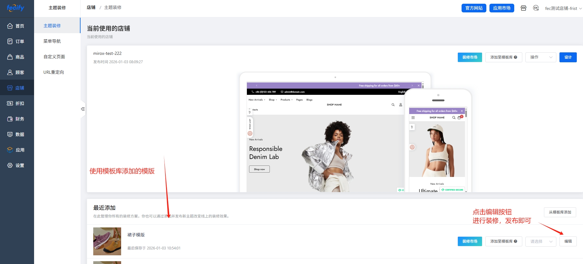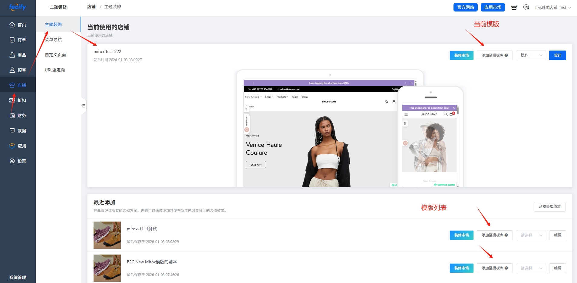 通过模板库功能,您可以提前装修出来多套模版,然后进行多个店铺的应用,当然您也可以使用系统的装修市场:装修市场