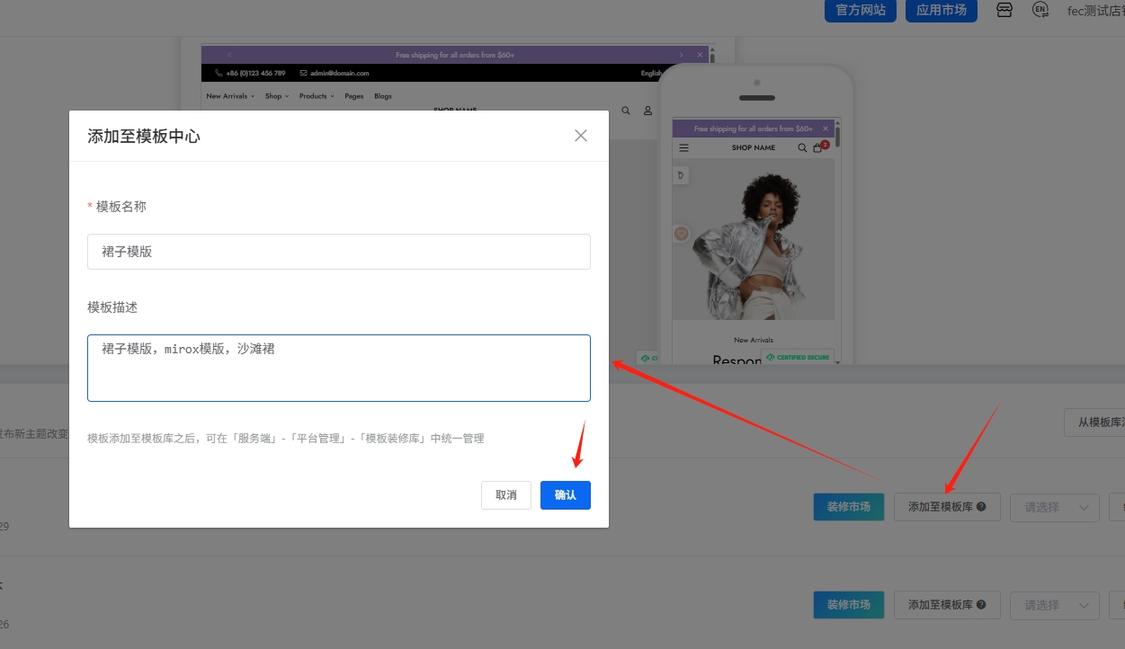 3.点击按钮,将已经装修好的模版,添加到模板库