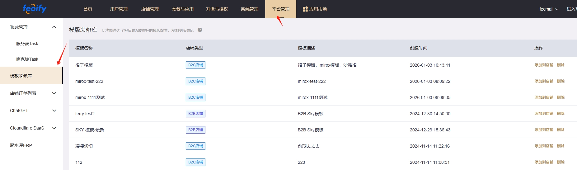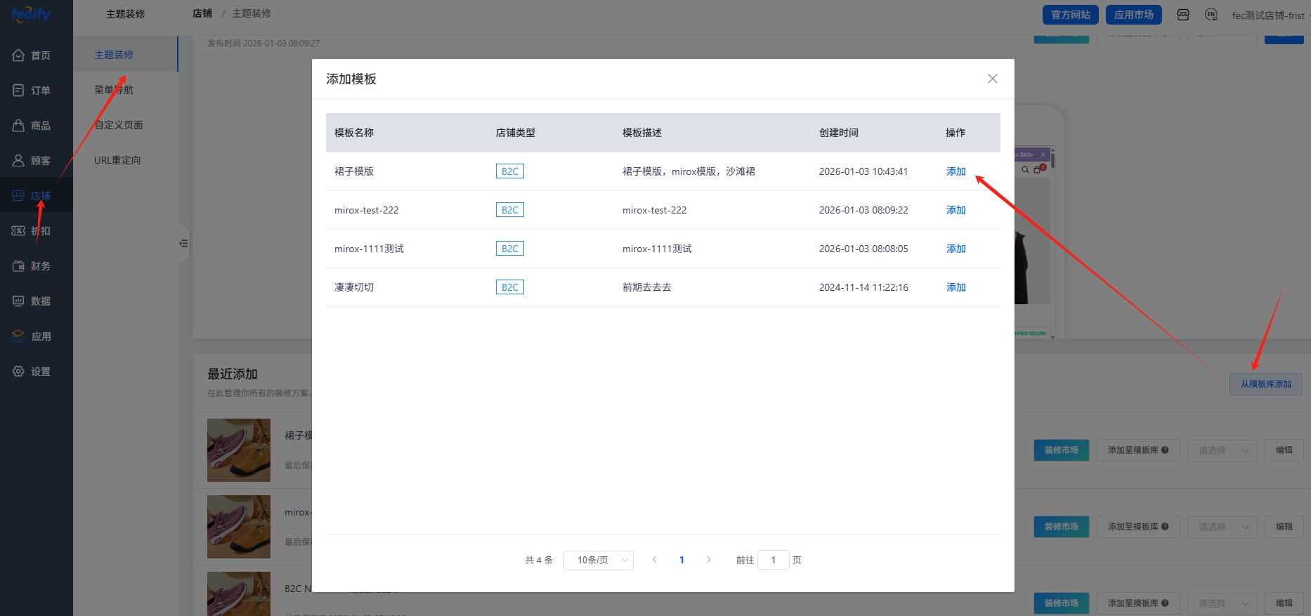 5.商家端后台,从模板库,进行模版装修的添加