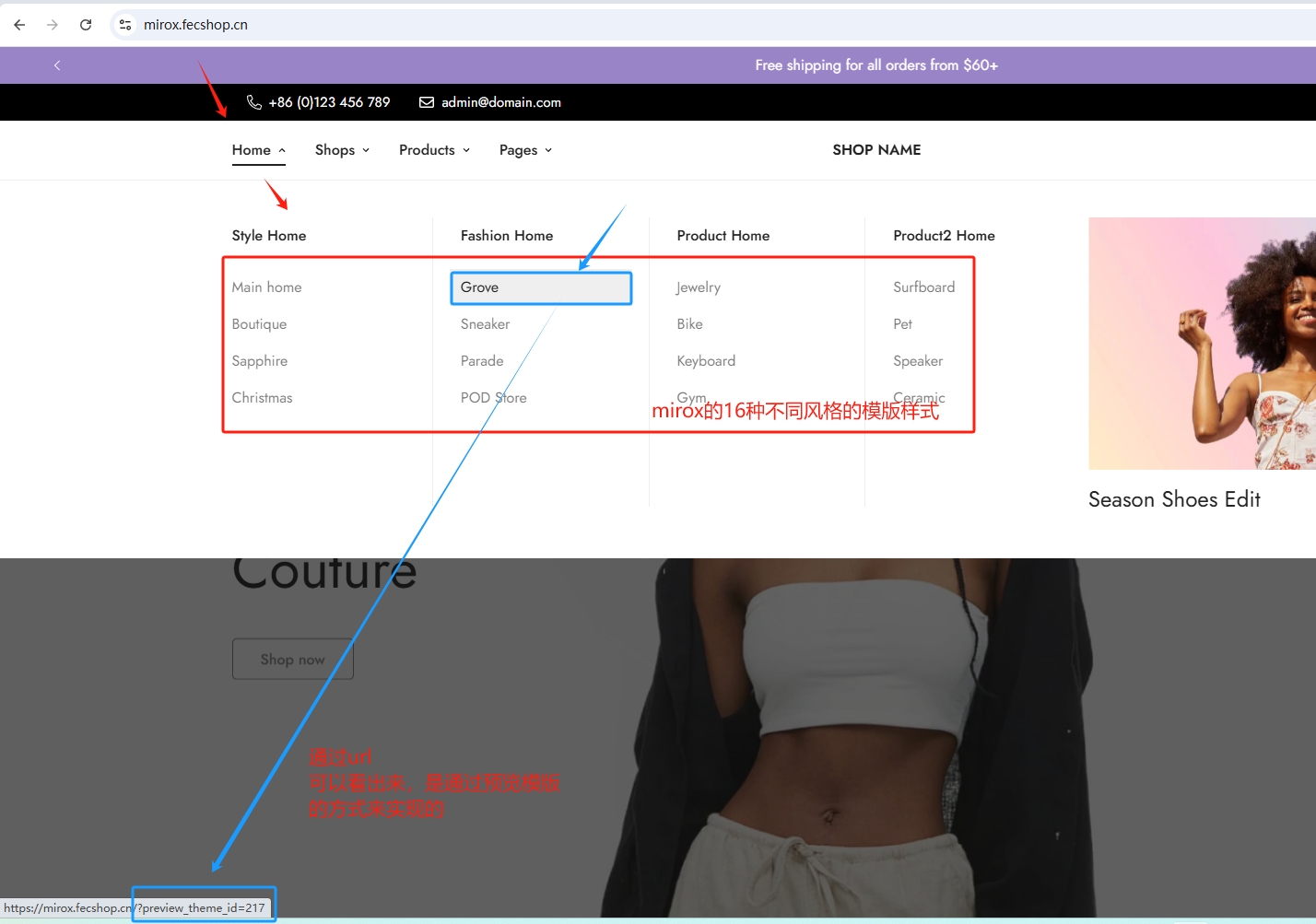 https://mirox.fecshop.cn,在一个店铺里面实现不同风格的演示