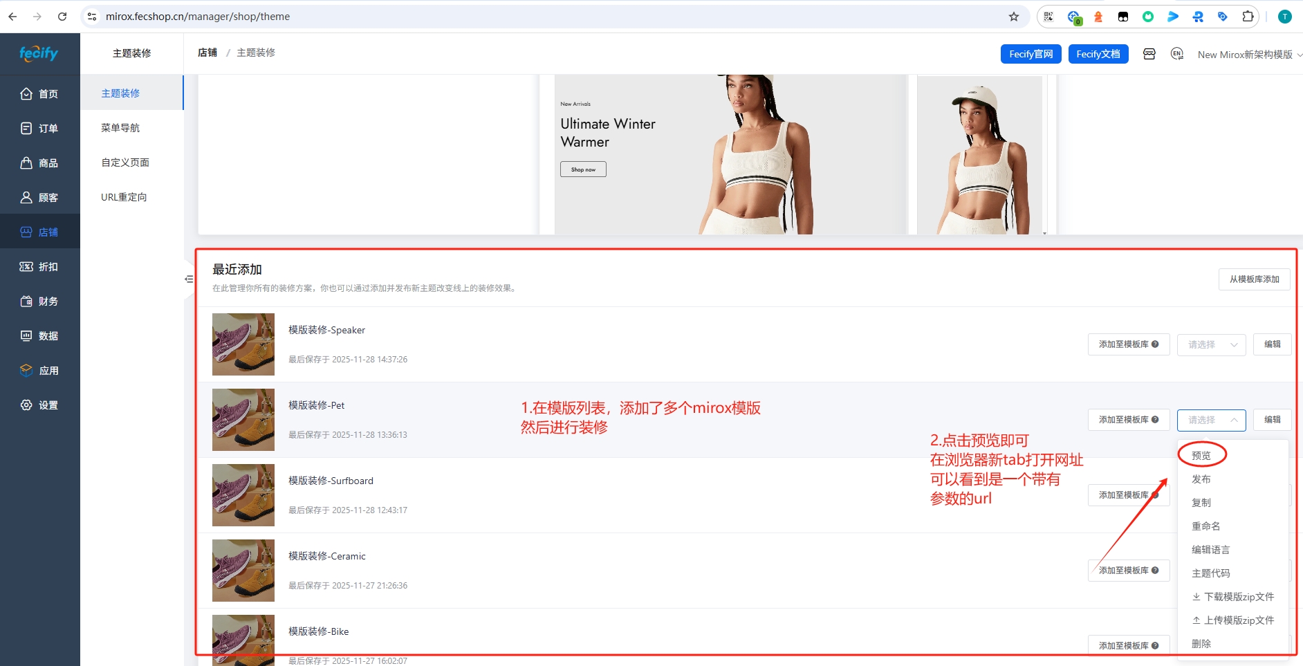 - 点击预览,即可在浏览器新tab中打开这个url,譬如:https://mirox.fecshop.cn/?preview_theme_id=229