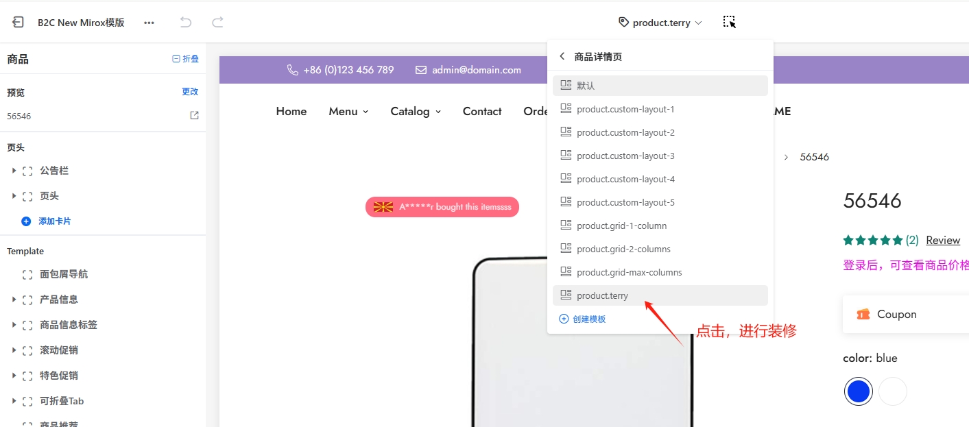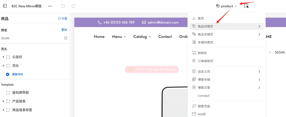 7.对于商品专辑,自定义页面,博客专辑,博客文章,操作逻辑和商品类似,您可以给设置指定的页面布局,