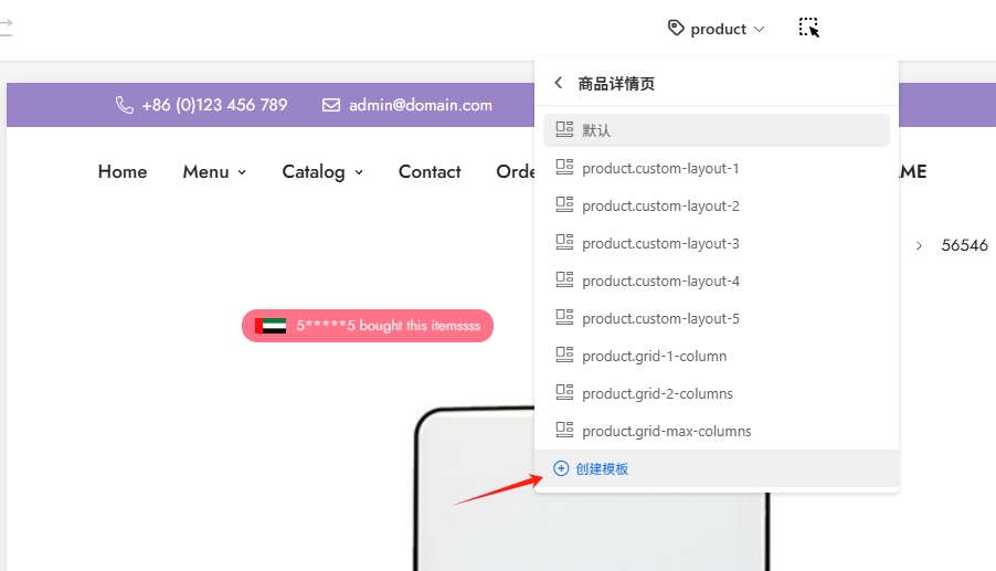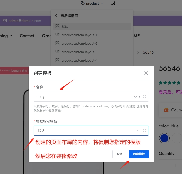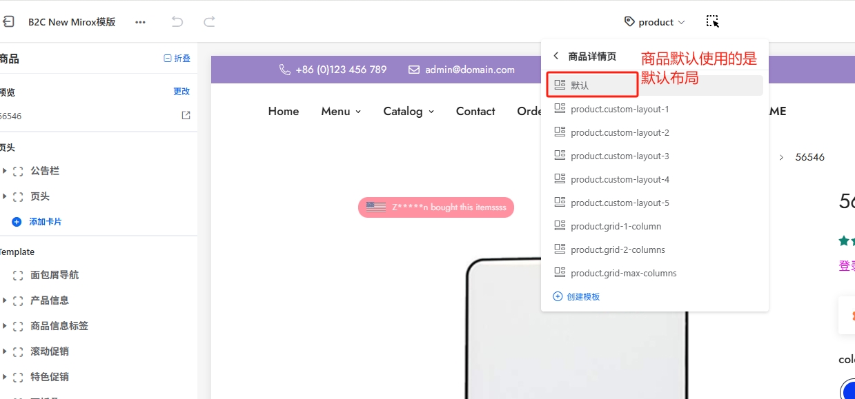 商品默认使用的页面布局,对应的默认布局, 您可以在商品详情页,对各个商品,进行自定义页面布局