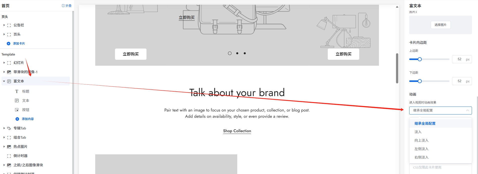3.大多数的装修卡片,都可以单独进行设置动画,如下图: