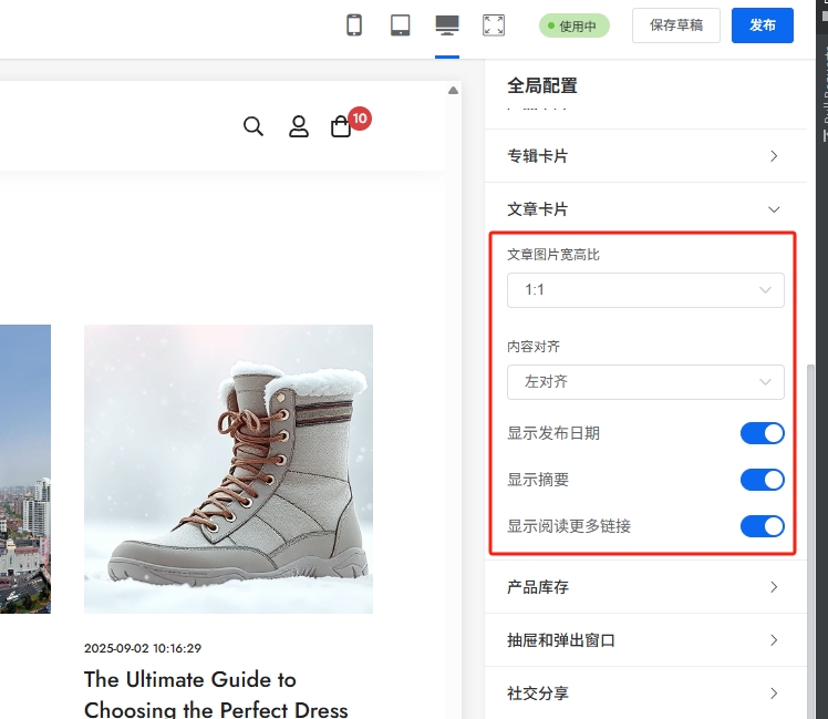 装修-全局配置:文章卡片&产品库存&抽屉弹窗