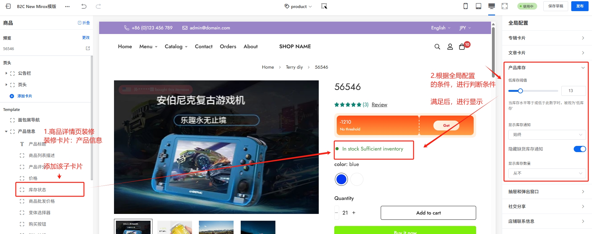- 始终:表示始终显示商品的库存状态,当库存充足,显示:In stock Sufficient inventory