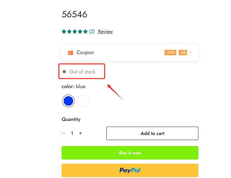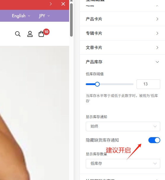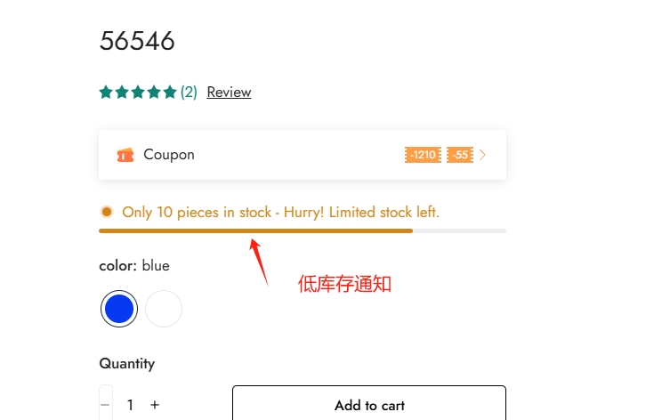 - 低库存:表示当库存充足,则不显示信息,当低库存的时候显示库存通知信息,譬如:Only 12 pieces in stock - Hurry! Limited stock left.