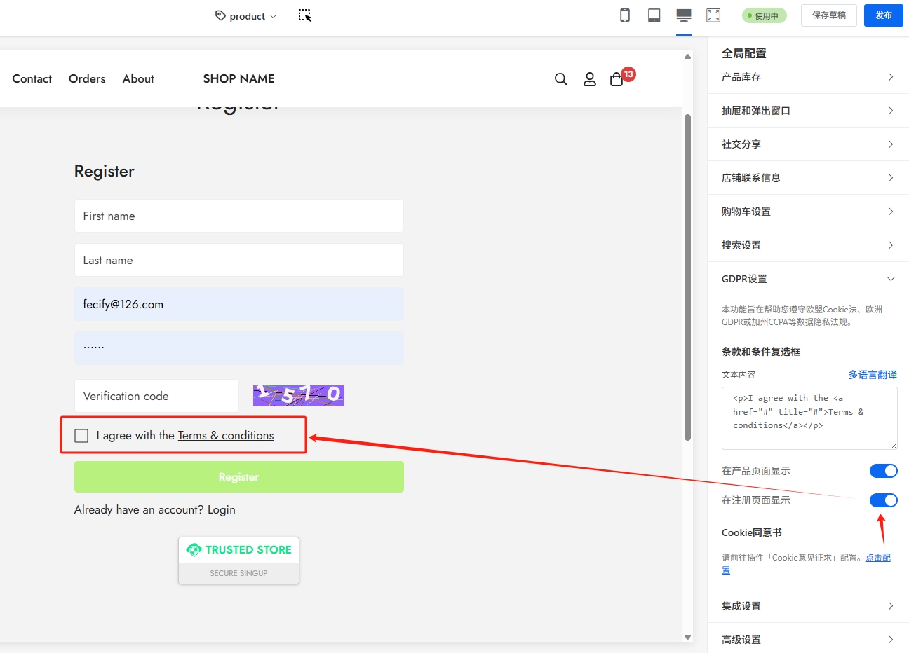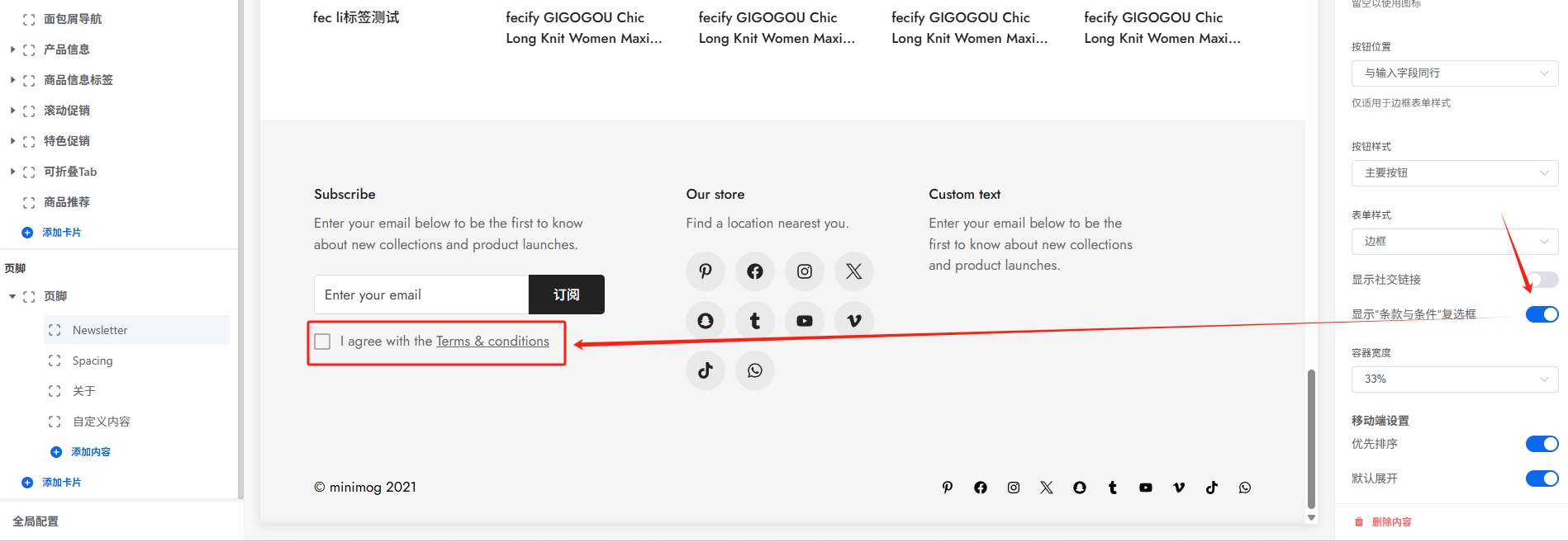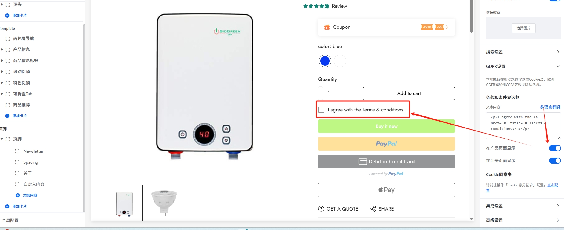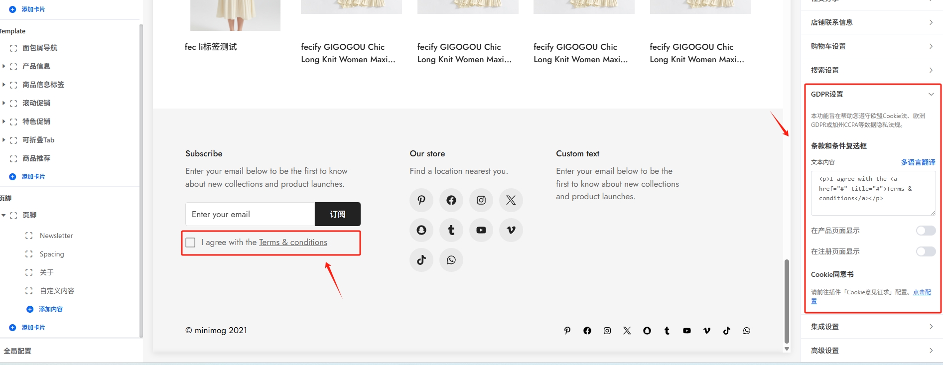 在newsletter,产品加入购物车,账号注册,按钮提交之前,显示文字条款以及相应的链接,用户勾选后,才允许提交
