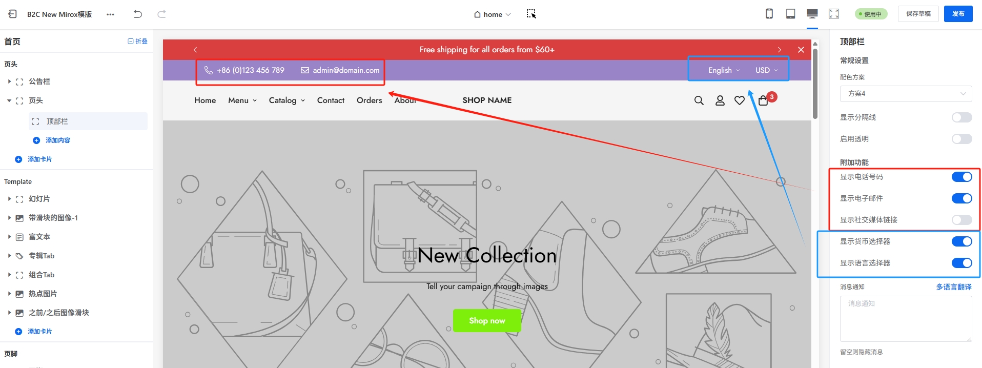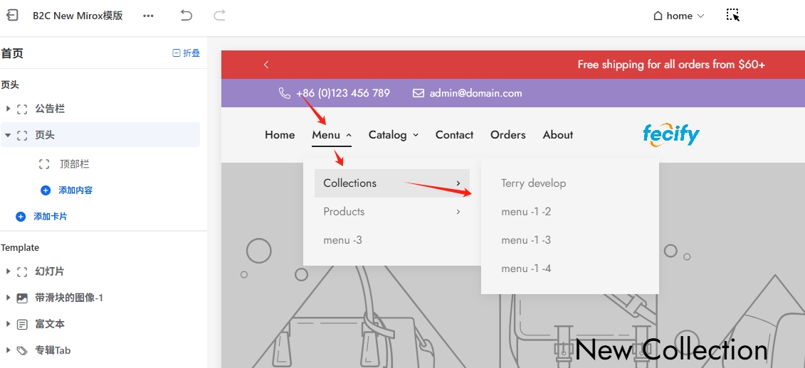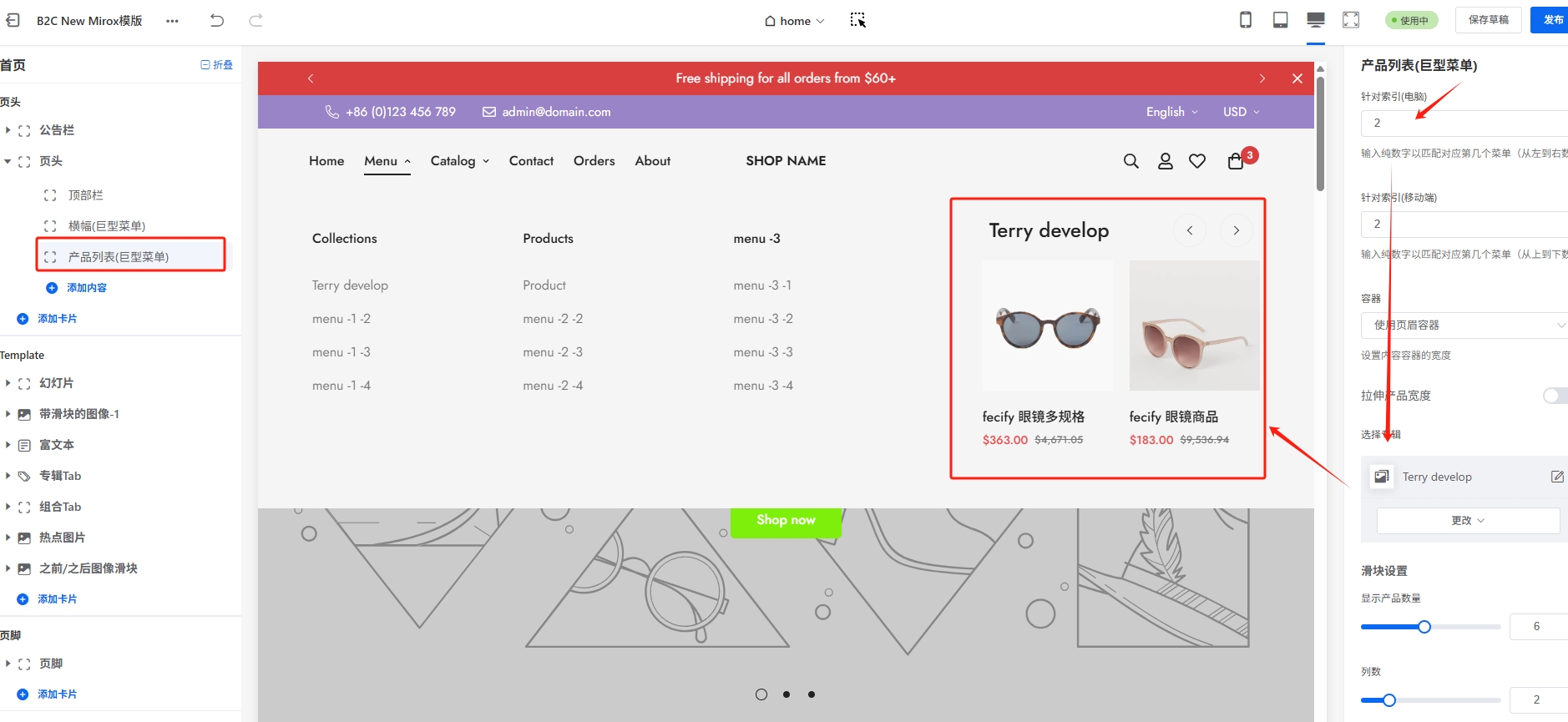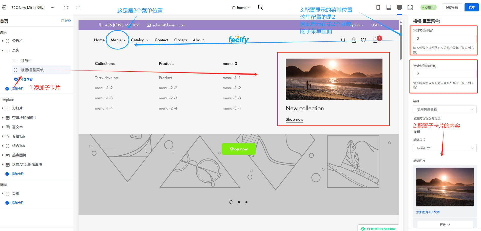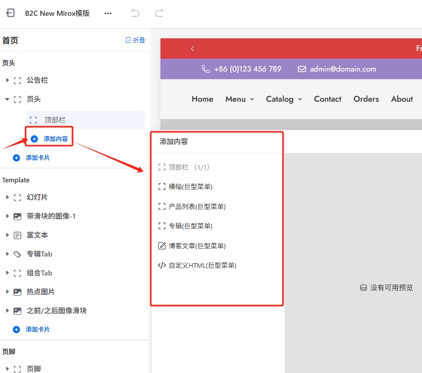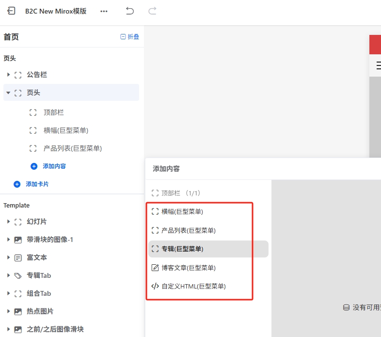 Mirox模版的页头部分,有一个重要的装修卡片:页头卡片,该卡片里面有logo,菜单,搜索,多语言等等 ,因为这个卡片内容比较多,设置比较复杂,因此我们单独进行讲解