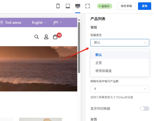 关于默认宽度和容器盒宽度的设置,参看:通用设置&布局设置