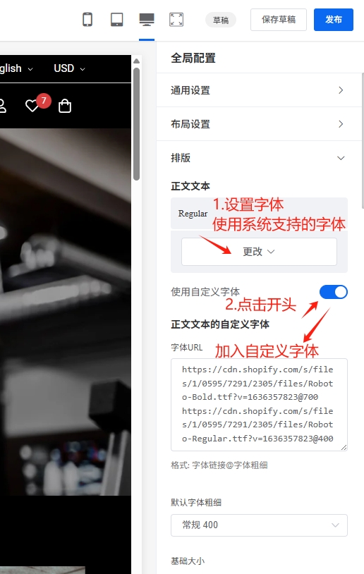 注意:打开开关(使用自定义字体)后,您需要设置自定义字体的url