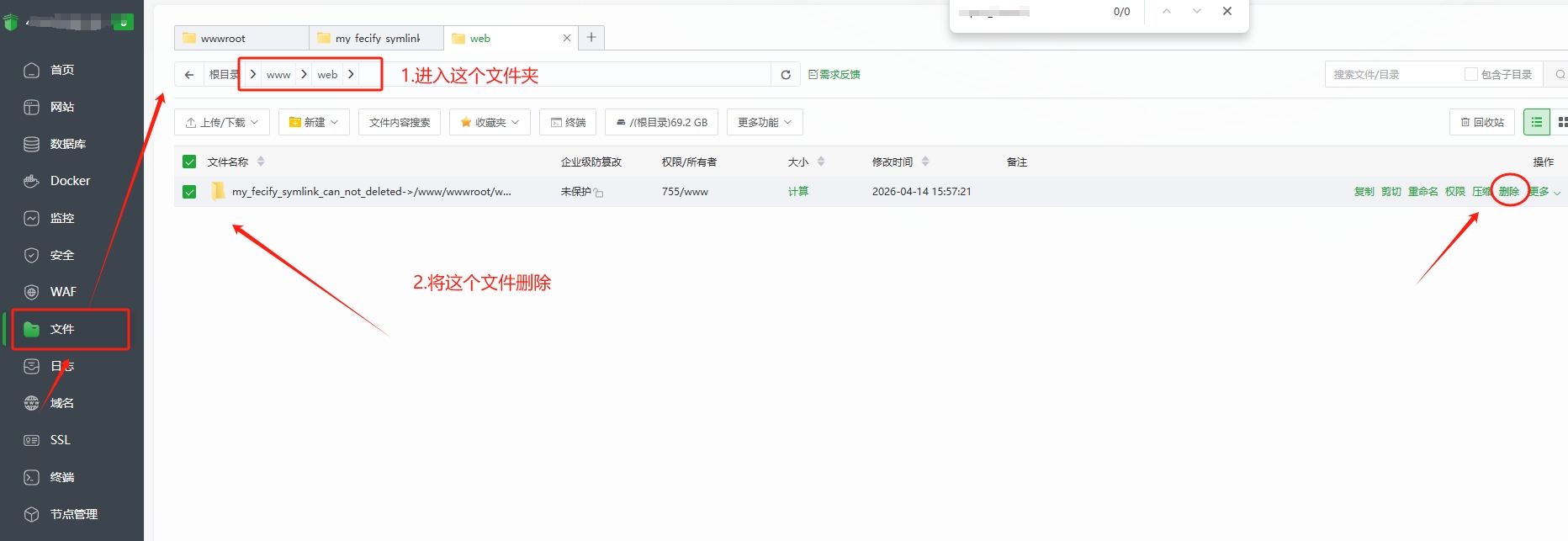 3.1进入宝塔,点击左侧的菜单:文件,页面刷新后,进入文件路径:/www/web,然后查看是否存在(如下图)