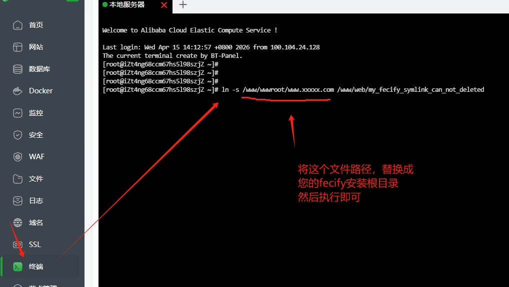 将/www/wwwroot/www.xxxxx.com替换成您自己的fecify的安装根目录后,进入终端执行上面的命令行