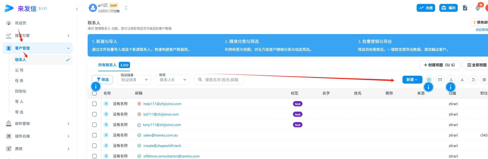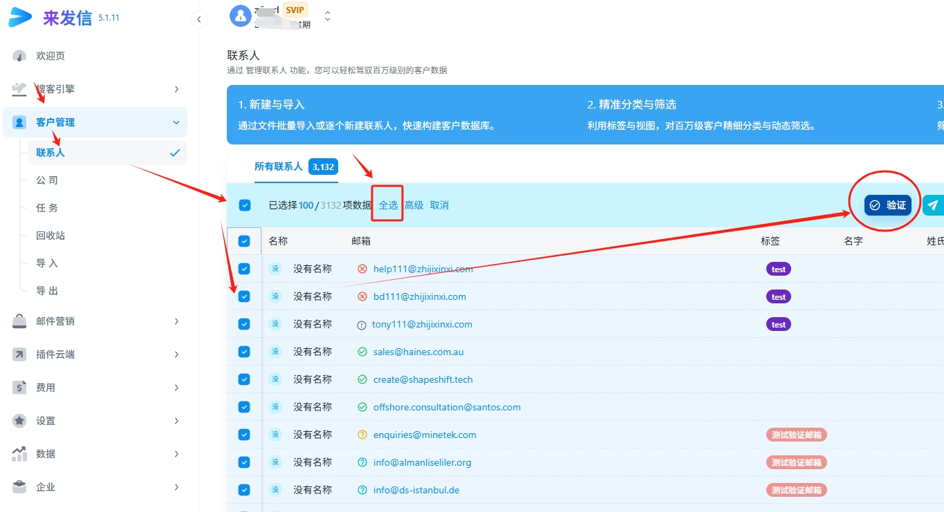 - 通过上面的步骤,将客户联系人信息导入来发信后,就可以进行邮箱的验证