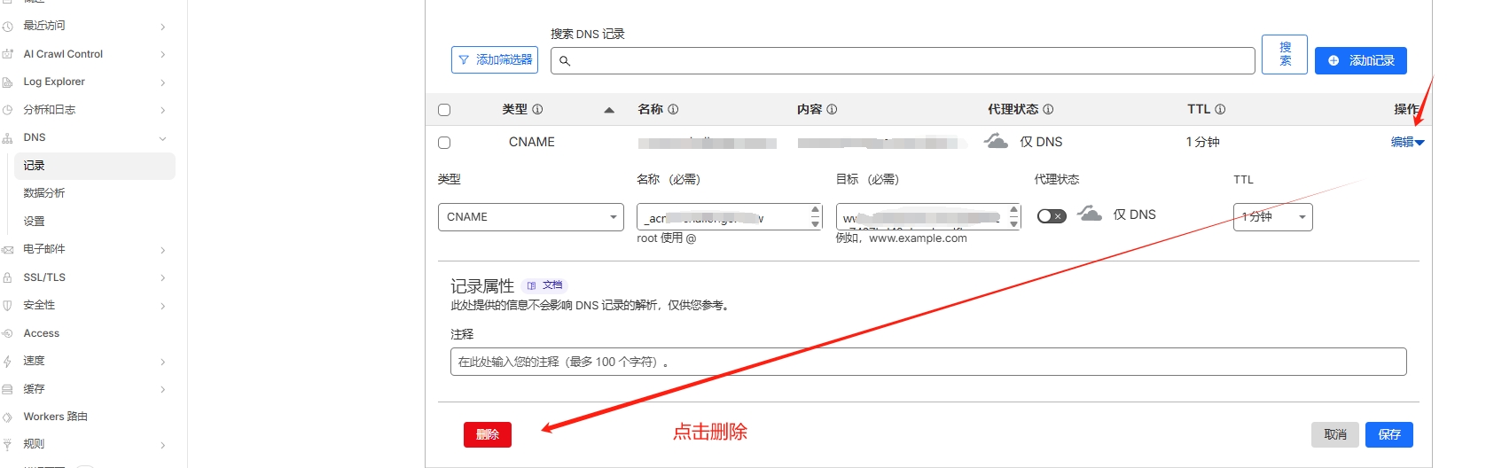 - 注意:删除记录,别删除错了,将txt等其他的删除了,这里删除的是cname解析记录