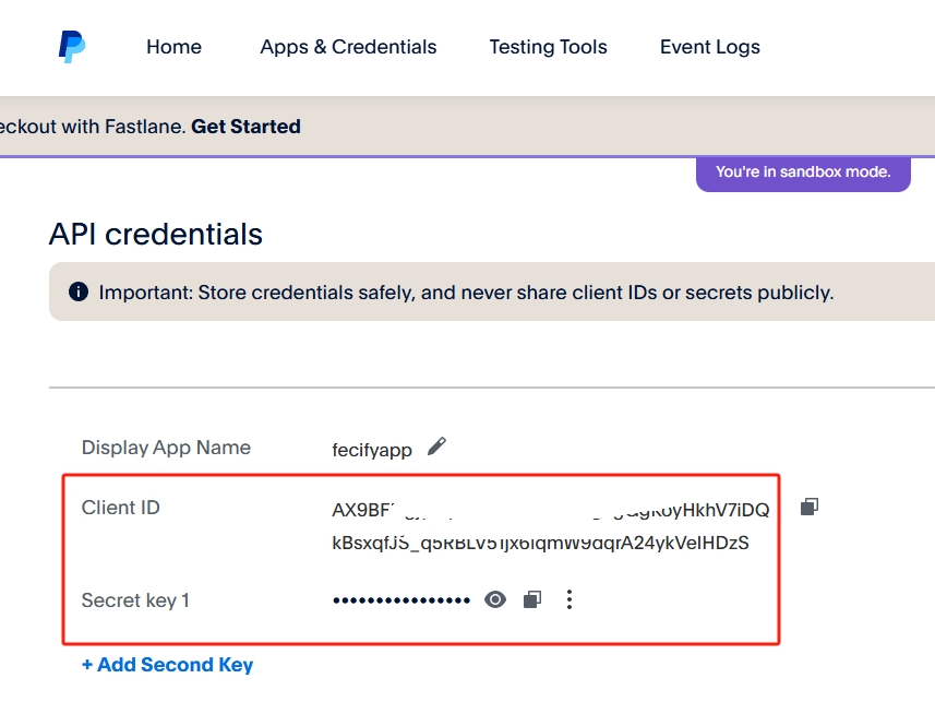 将创建好的 client id和 client secret ,填写到fecify paypal设置中即可。